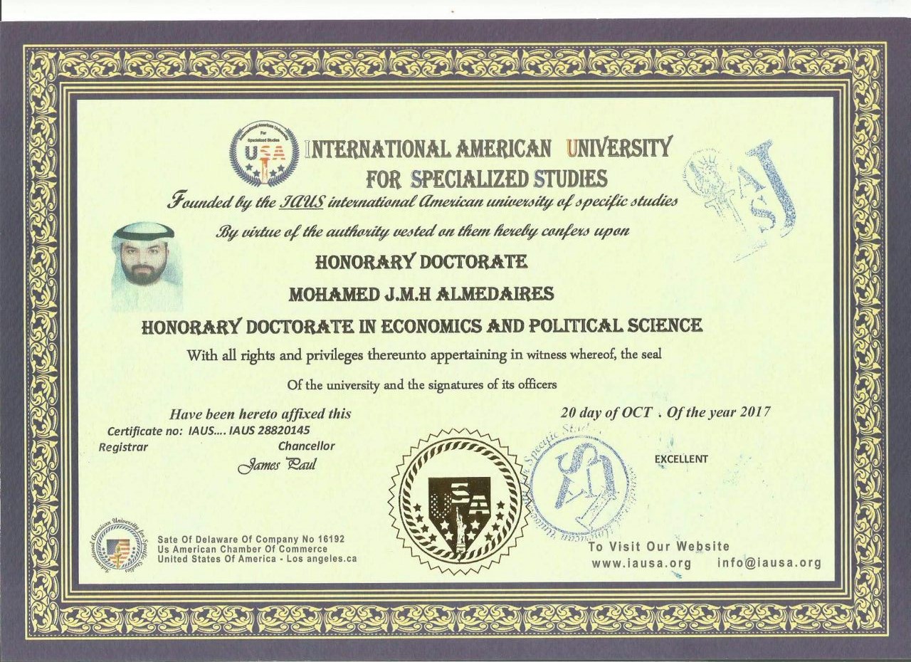 منحت الجامعة الأمريكية الدولية ، شهادة دكتوراه فخرية لكلٍ من : صاحب السمو الملكي الأمير الشاعر بدر بن عبدالمحسن آل سعود ، والسفير د. محمد جاسم المديرس ، وفنان العرب محمد عبده وذلك تقديرًا لعطاءاتهم في الشعر والغناء والموسيقى ، أما د.المديرس فقد نالها لمجهوده في تنمية المجتمع المدني الدولي ..