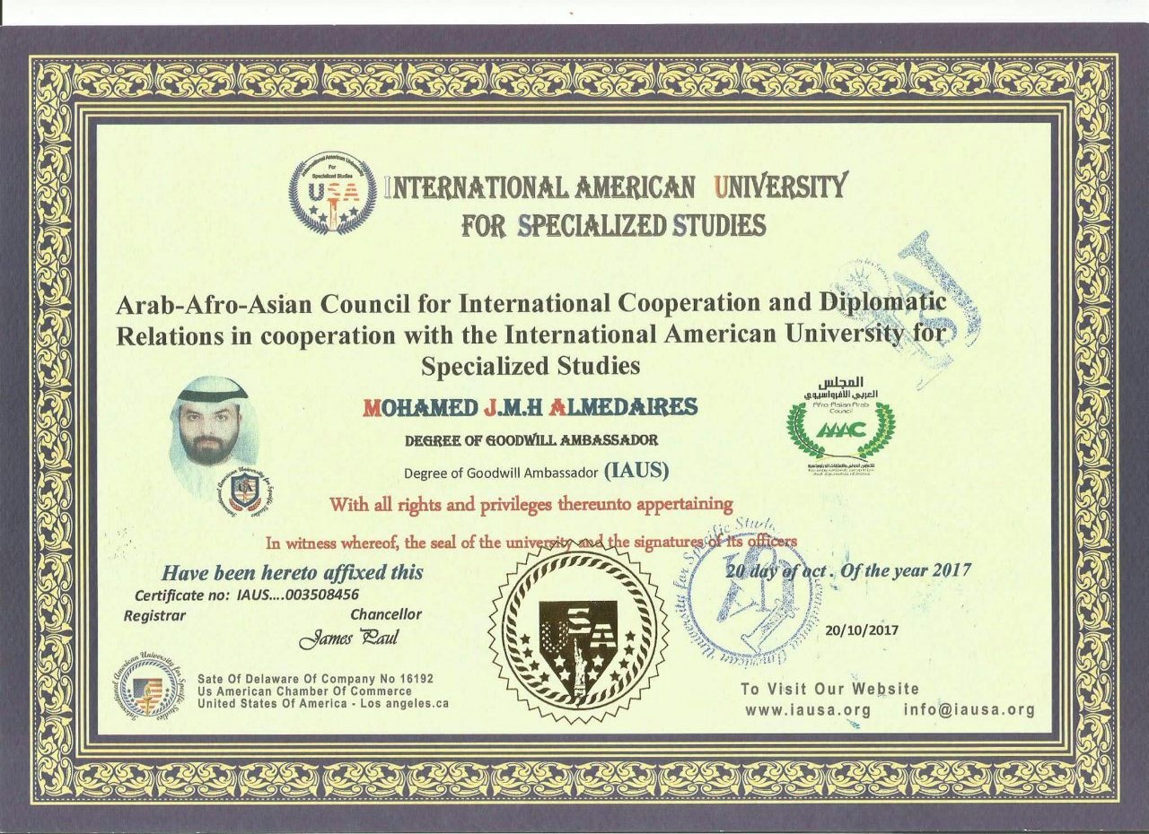 جهة أخرى تم تعين السفيرد.محمد جاسم المديرس سفيرا للمجلس العربي الأفروآسيوي