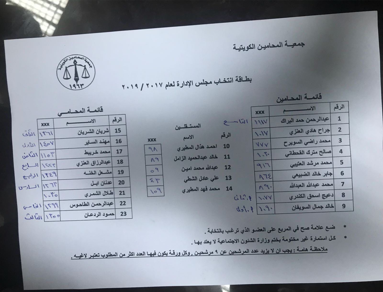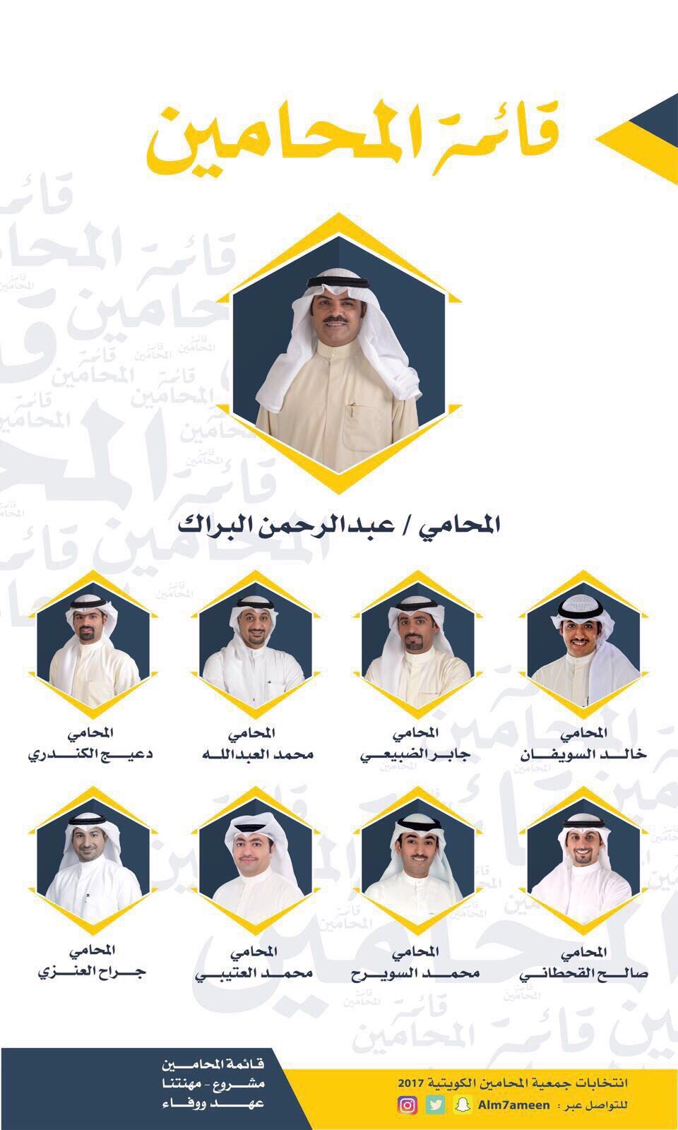 وعدنان أبل وعبدالرزاق العنزي ، وتنافسها قائمة «المحامين» التي يرأسها المحامي