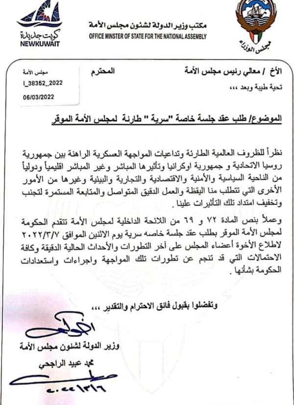 وقال الوزير الراجحي إن هذا الطلب يأتي «عملا بنص المادتين 69 و72 من اللائحة الداخلية لمجلس الأمة وبالنظر إلى الظروف العالمية الطارئة وتداعيات المواجهة العسكرية الراهنة بين جمهوريتي روسيا الاتحادية وأوكرانيا وتأثيرها المباشر وغير المباشر إقليميا ودوليا من الناحية السياسية والأمنية والاقتصادية والتجارية والبيئية وغيرها من الأمور الأخرى التي تتطلب منا اليقظة والعمل الدقيق المتواصل والمتابعة المستمرة لتجنب وتخفيف امتداد تلك التأثيرات علينا». وذكر أنه سيتم خلال الجلسة الطارئة لمجلس الأمة اليوم إطلاع أعضاء المجلس على آخر التطورات والأحداث الحالية الدقيقة والاحتمالات كافة التي قد تنجم عن تطورات تلك المواجهة وإجراءات واستعدادات الحكومة بشأنها.