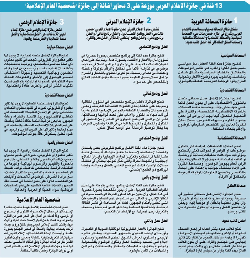 وأوضحت الأمانة العامة لجائزة الإعلام العربي أنه يشترط في جميع الأعمال المقدمة للجائزة ضمن مختلف فئاتها أن يكون قد تم نشرها أو بثها خلال عامي 2021و2022.